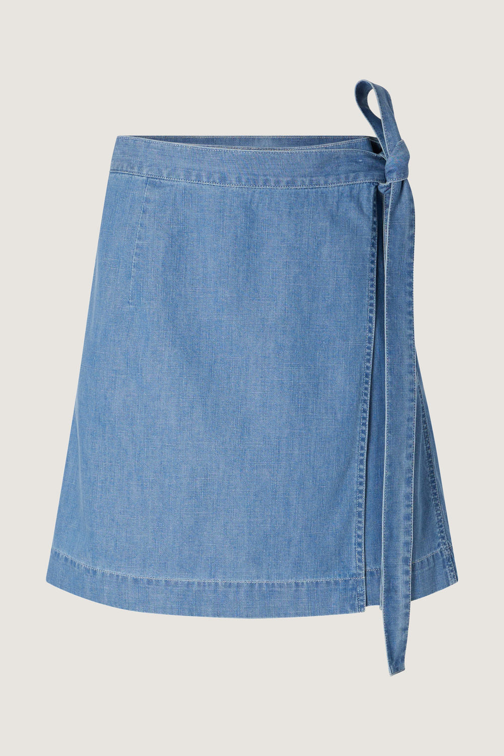 AIME es una falda envolvente asimétrica que sigue el estilo de los delantales que se atan al lado. Está confeccionada en chambray, un tejido más ligero que el denim, perfecto para el verano. Sus costuras en contraste aportan profundidad a la prenda.