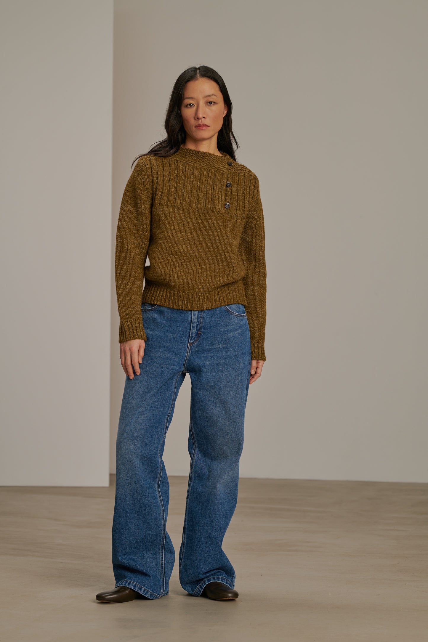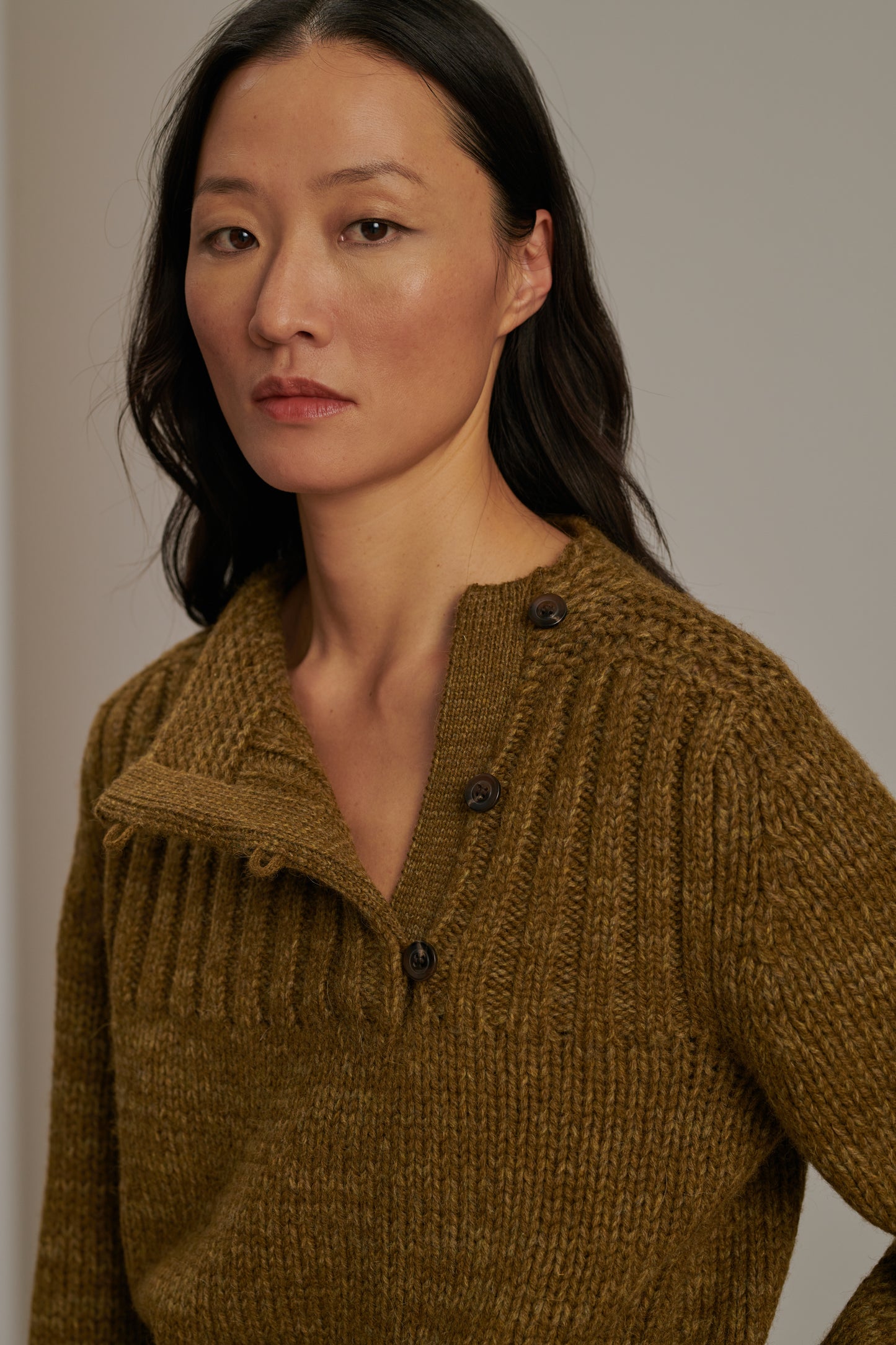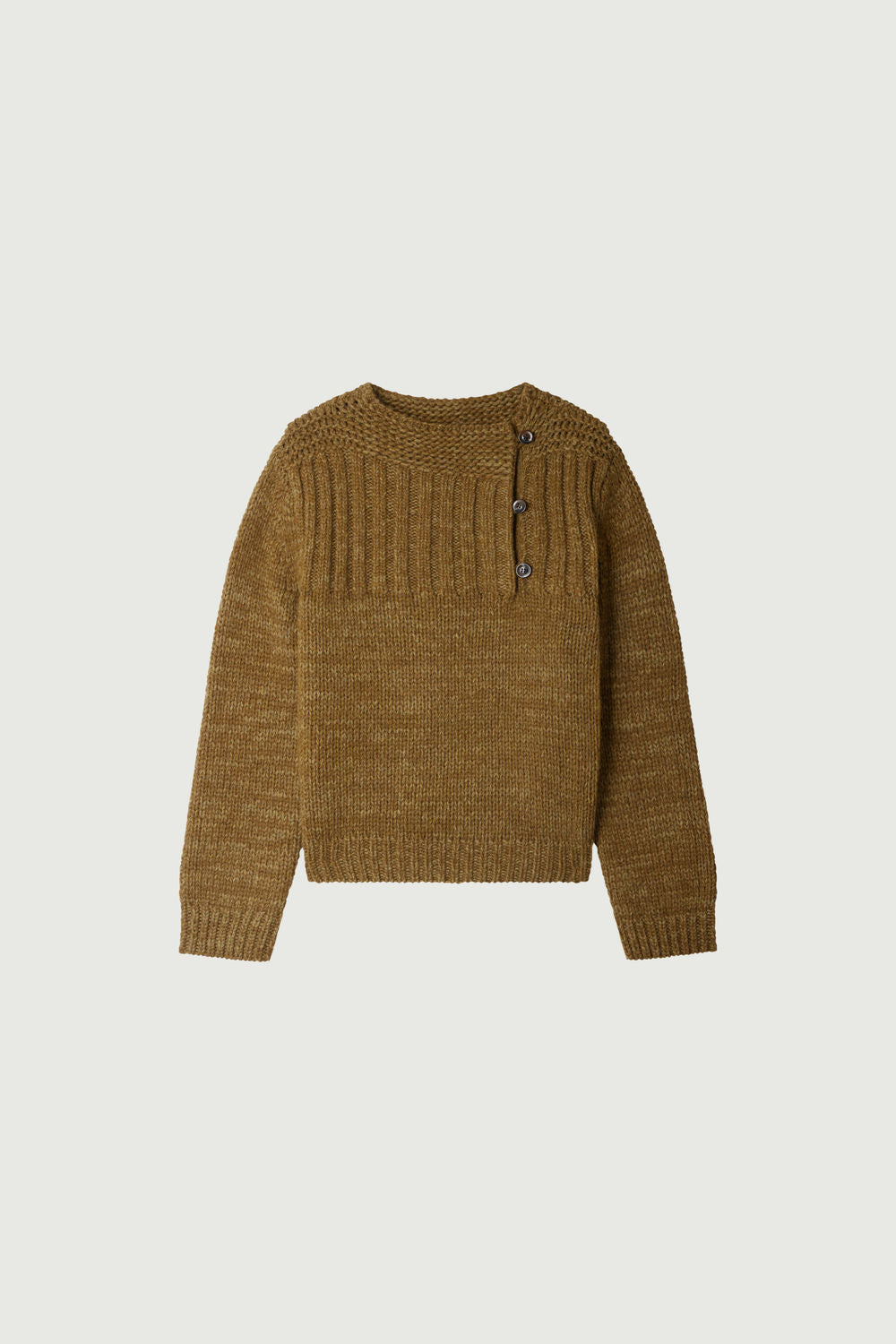 BISCAROSSE es un jersey de manga larga, tejido con un hilo jaspeado de lana virgen. Tejido en un punto grueso pero aireado, es flexible y cómodo. Una apertura abotonada en la parte delantera permite dejar entrever un escote en el costado. Con un efecto visual de rayas, el color se revela jaspeado en matices de caqui y bronce.