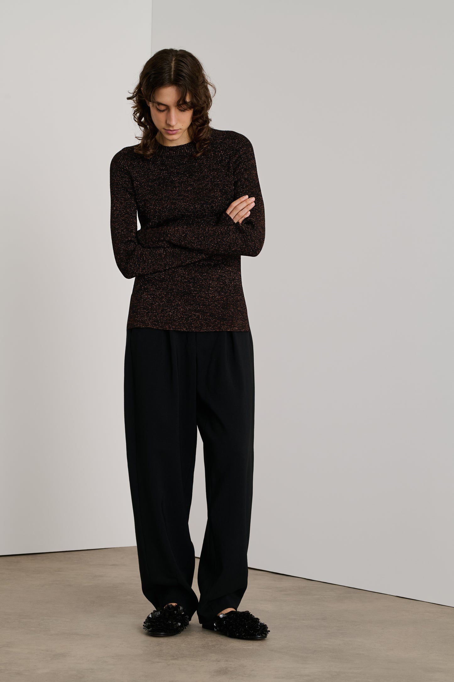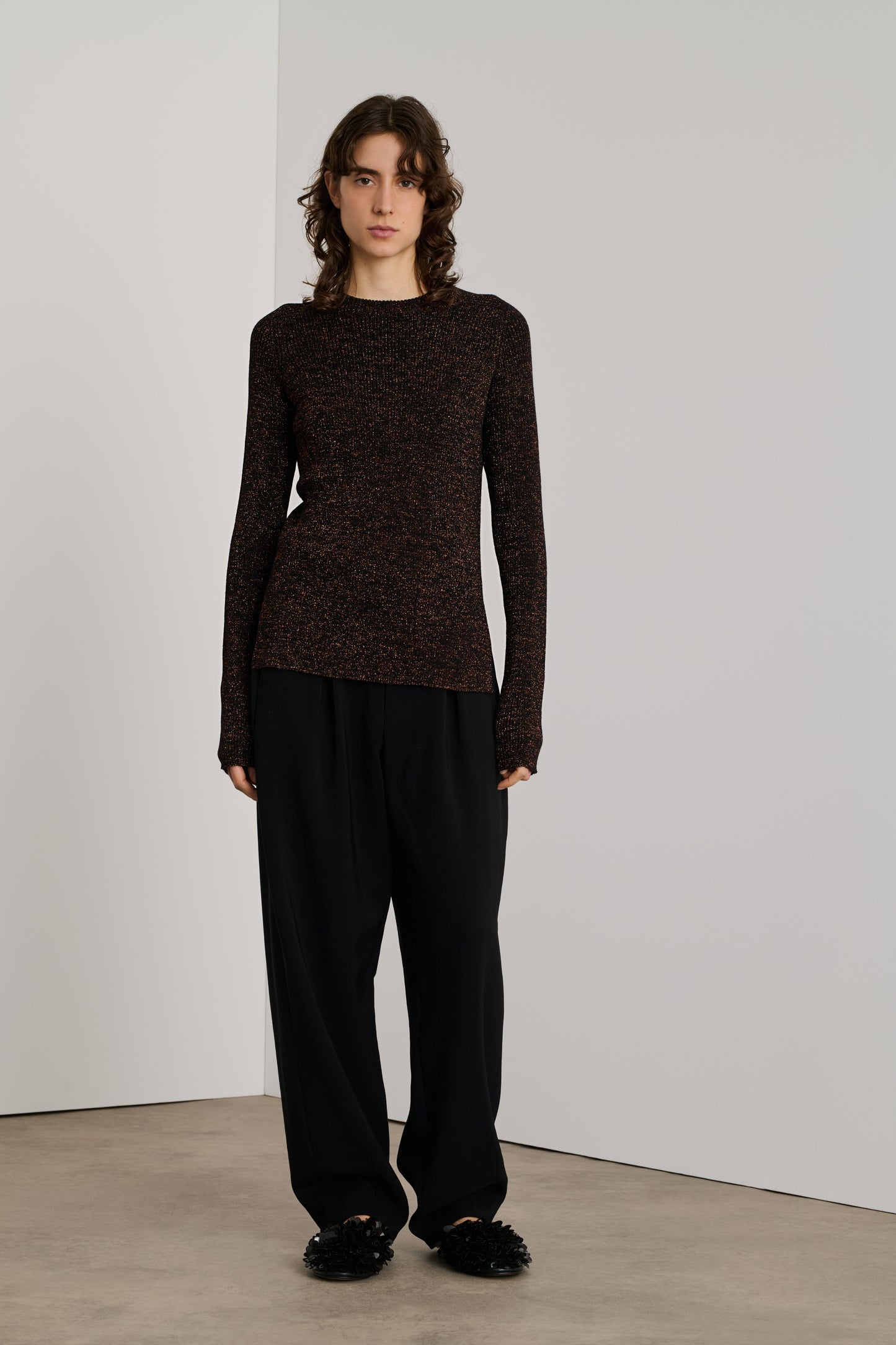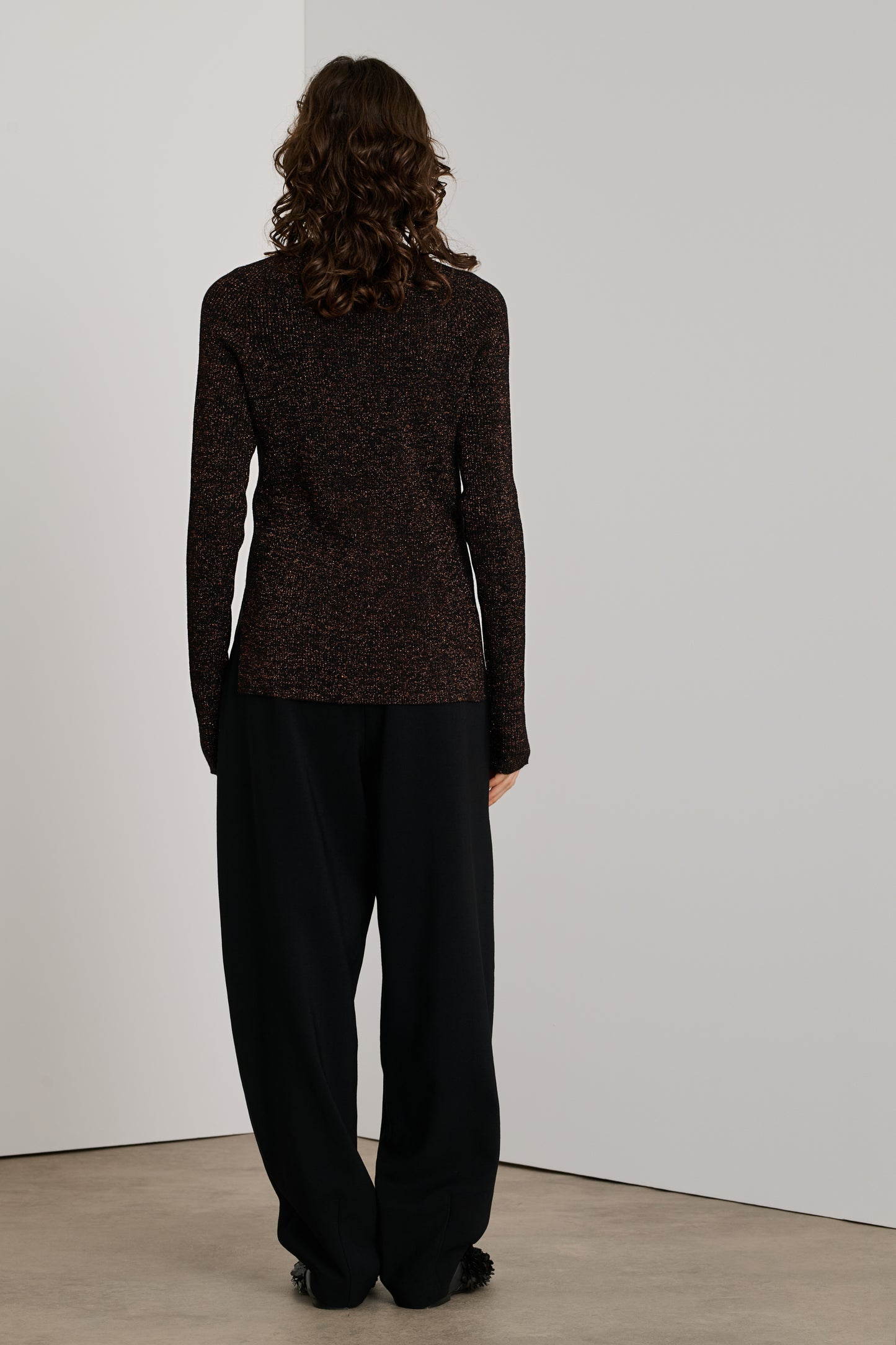 VERONA es un jersey acanalado tejido con hilo de lana merina, mezclado con lúrex para conseguir un efecto iridiscente. Tiene un corte recto y ceñido y un escote redondo.