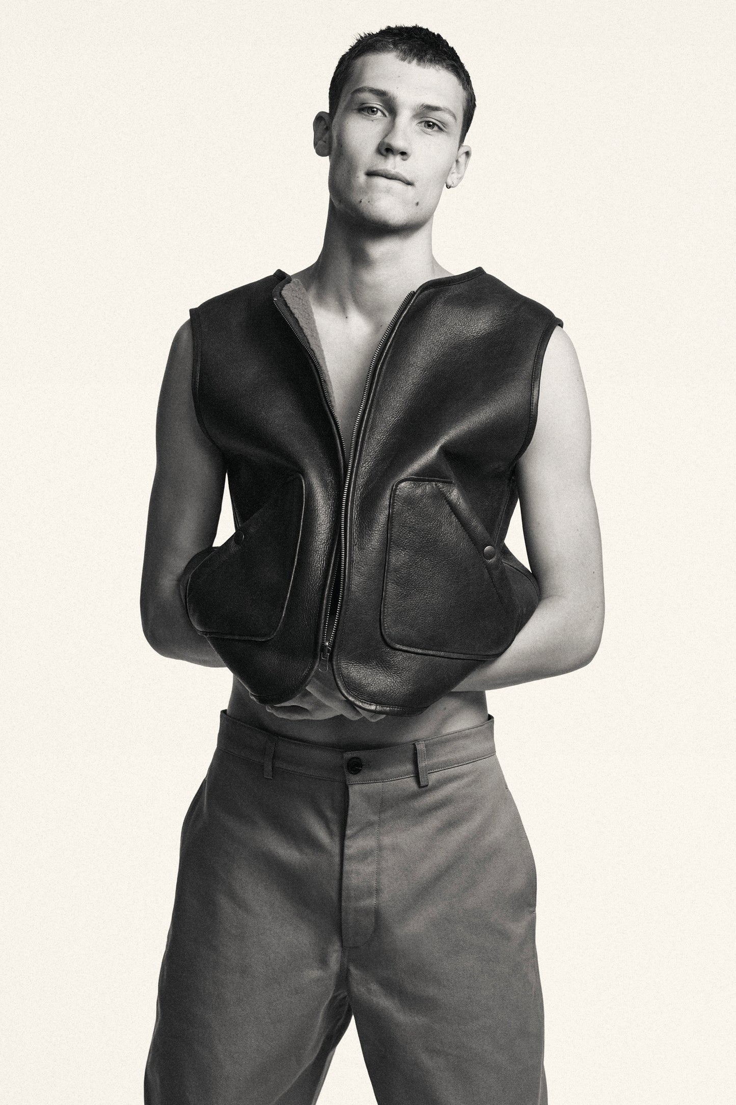 SAMO es un chaleco de auténtica piel de lana. Reversible, puede llevarse tanto por el lado liso de piel auténtica color chocolate como por el lado más acaramelado de hebilla marrón. El corte es holgado y recto, con dos bolsillos de parche en el lado de piel que le dan un aire laboral.